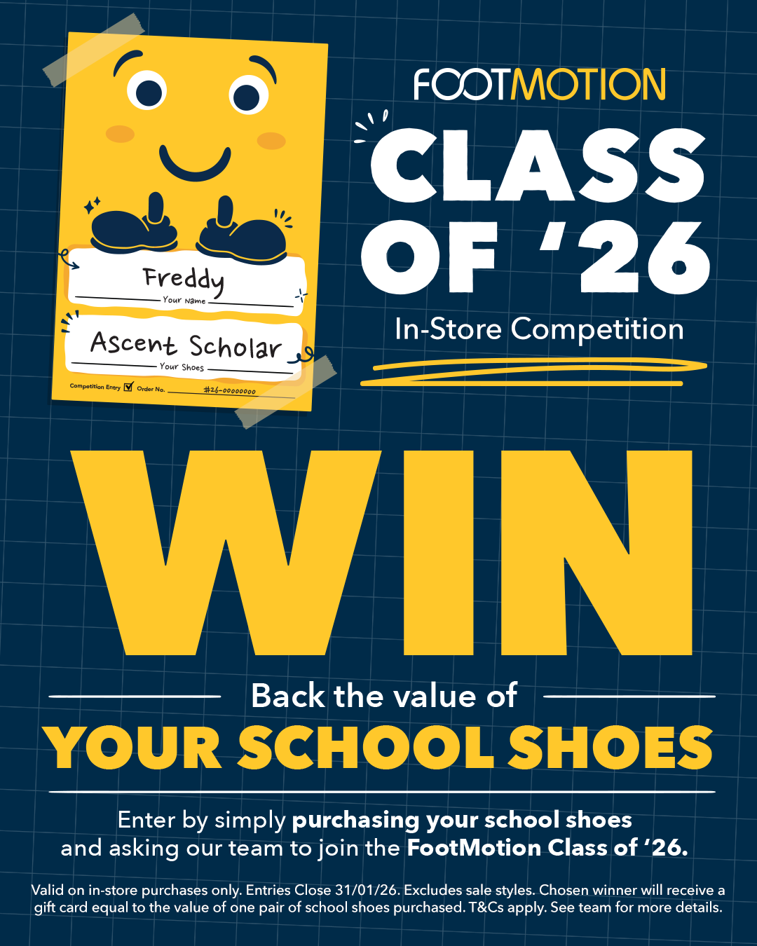 From 8 to 31 January 2026, every full price school shoe purchase in store gives you the chance to be part of the FootMotion Class of 2026.