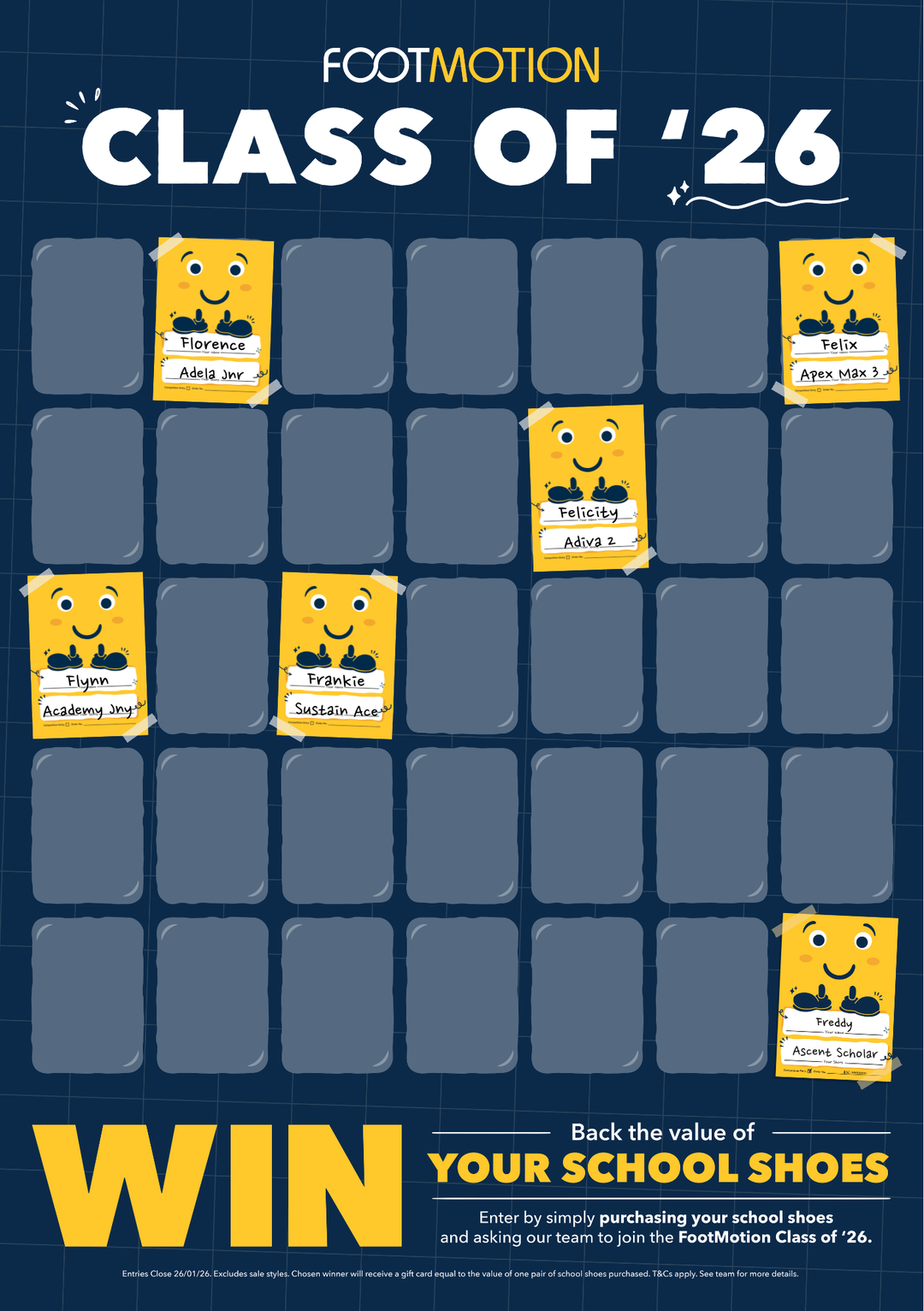 From 8 to 25 January, every full price school shoe purchase in store gives you the chance to be part of the FootMotion Class of 2026.