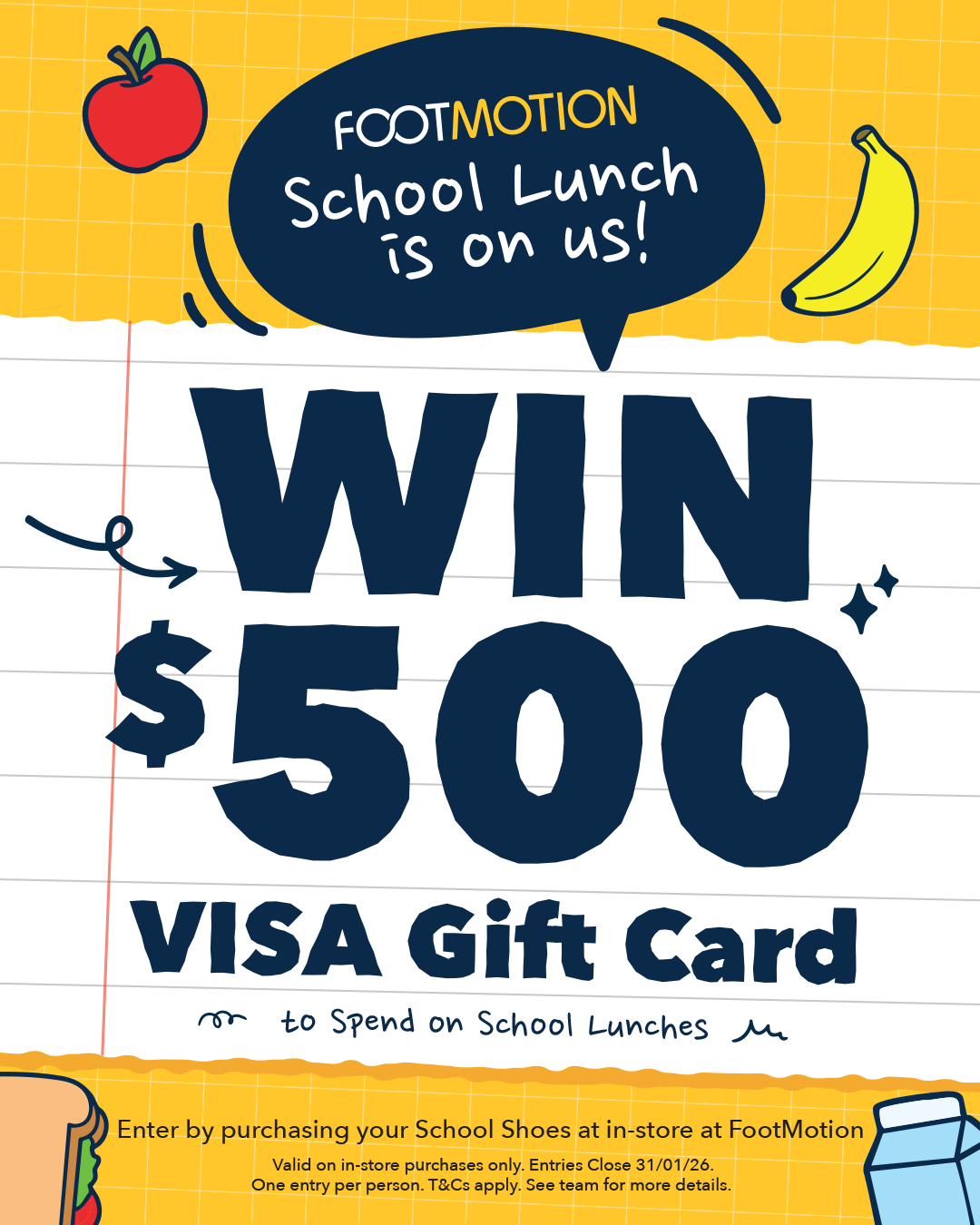 From 8 to 31 January 2026, every time you purchase a full price school shoe in store, you’ll go into the draw to win a $500 Visa Gift Card, perfect for covering school lunches, groceries or those extra back to school essentials.